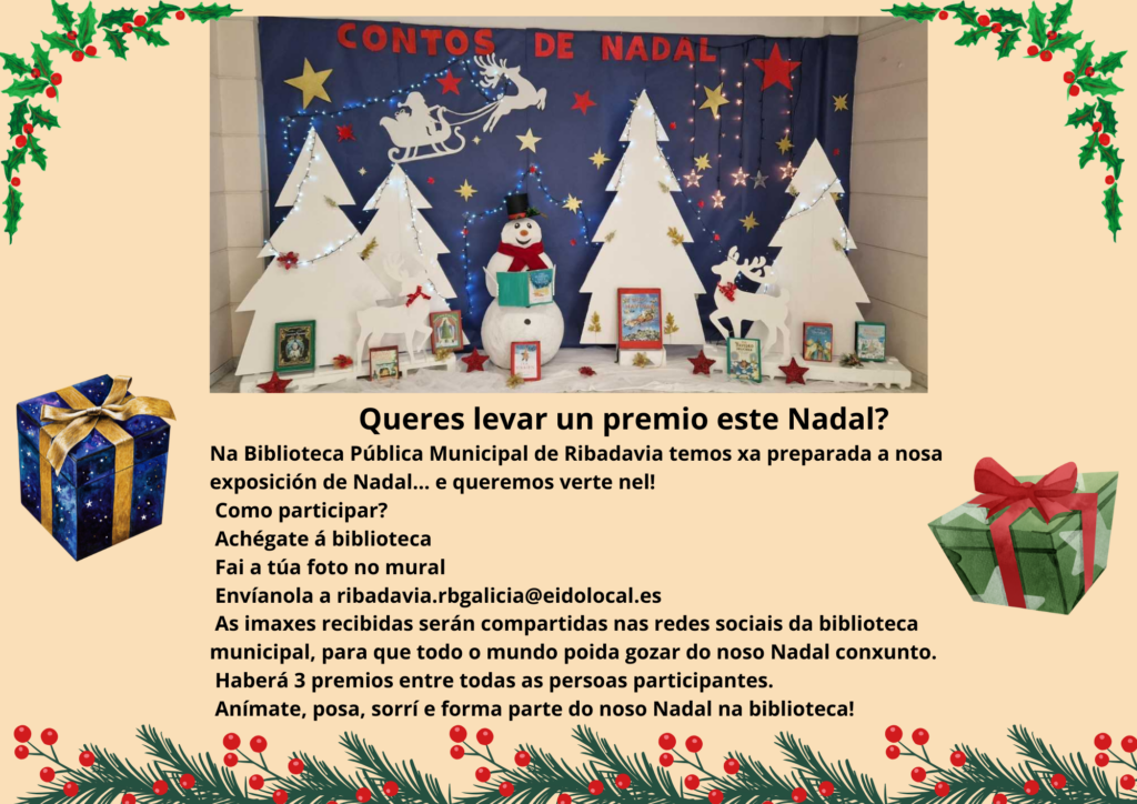 For Christmas, the Ribadavia Municipal Public Library put together a Christmas-themed bibliographic exhibition with a creative and sustainable approach. The entire display was made using recycled materials from previous exhibitions: bibliographic panels transformed into trees and reindeer, and a snowman created from reused Christmas ornaments painted white.