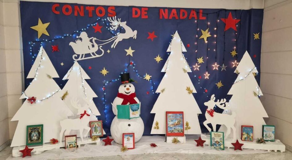 For Christmas, the Ribadavia Municipal Public Library put together a Christmas-themed bibliographic exhibition with a creative and sustainable approach. The entire display was made using recycled materials from previous exhibitions: bibliographic panels transformed into trees and reindeer, and a snowman created from reused Christmas ornaments painted white.