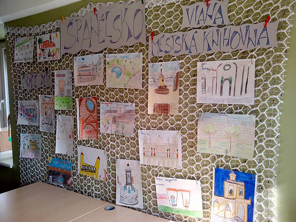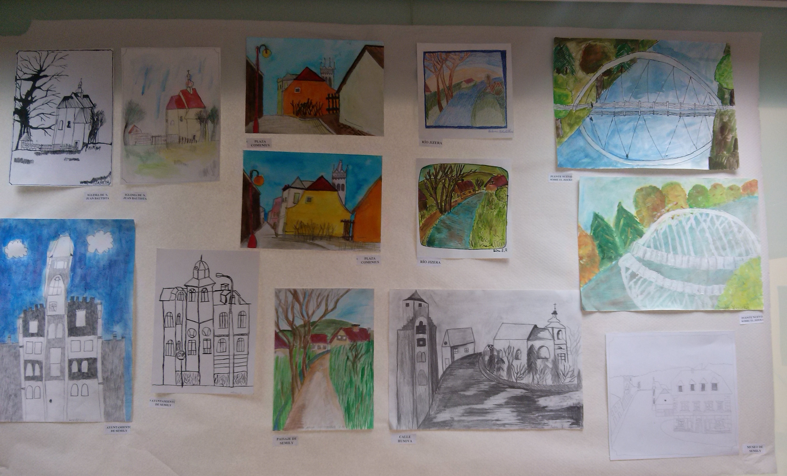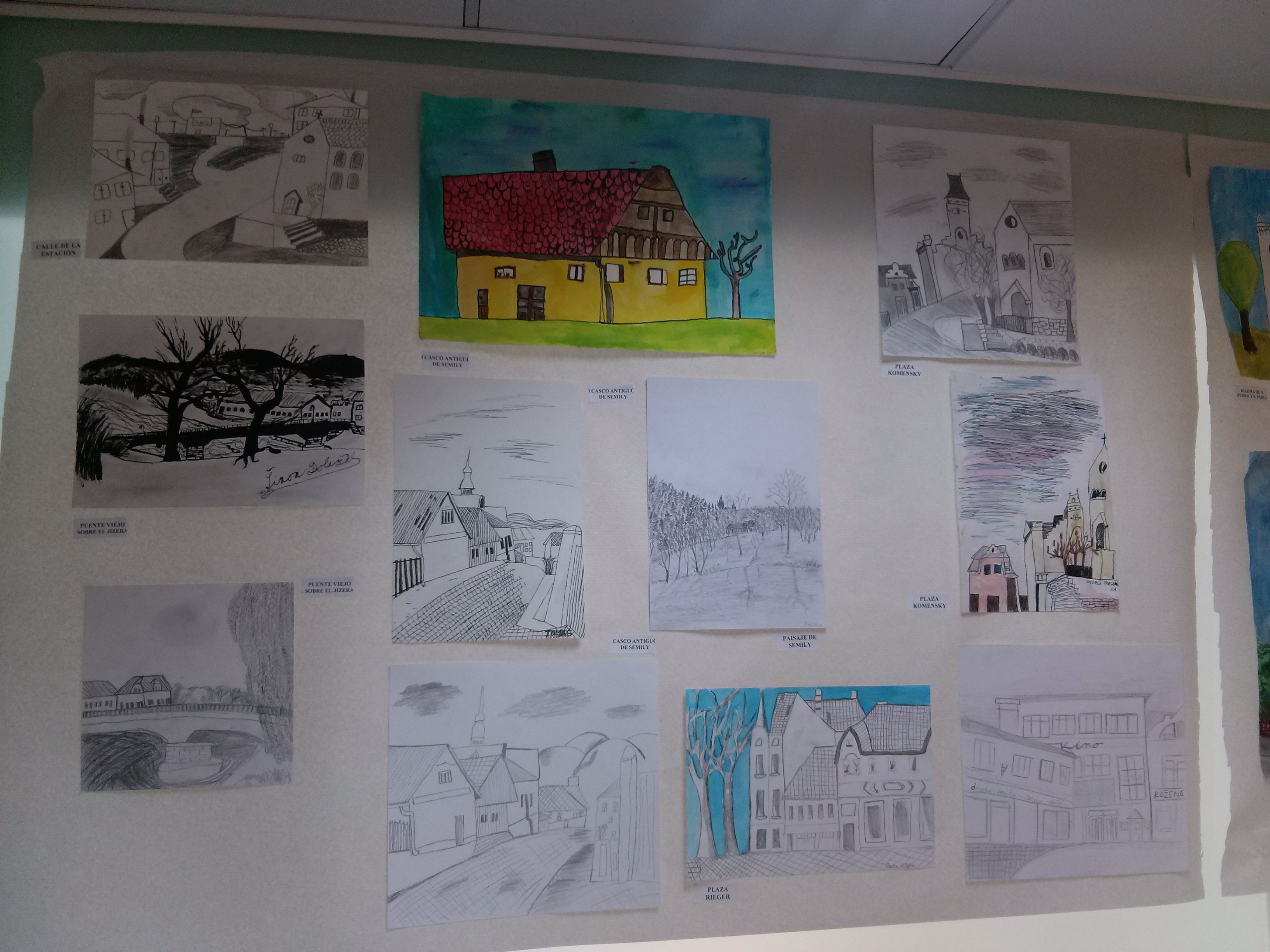Children from schools of Semily and Viana drew emblematic places of their cities (squares, buildings, etc.), wich were sent to their respective Sister Libraries, to be exhibited there. As Iñaki Suso -librarian at Viana Public Library- explains, the exhibition has been a success in their library, so they had to keep it open for a few weeks, until International Book Day.